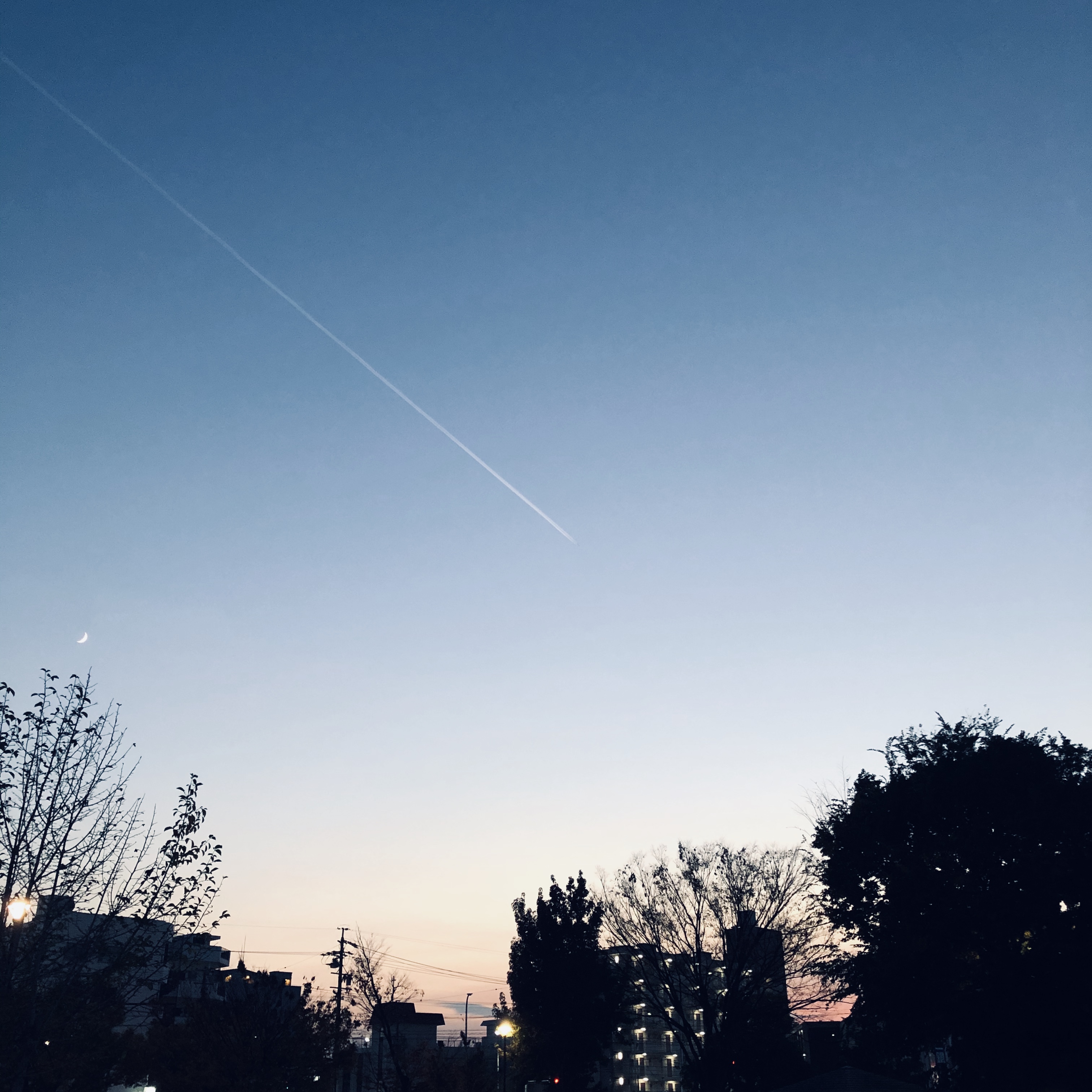 夕方、外に出たら、夕焼けと飛行機雲と三日月が綺麗でした。